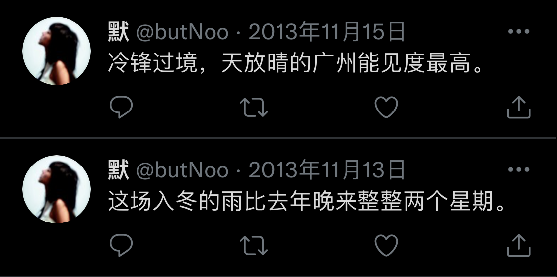 我又想起了前几天的几张Twitter信息截图,里边是我过去某几年有关天气的记录。