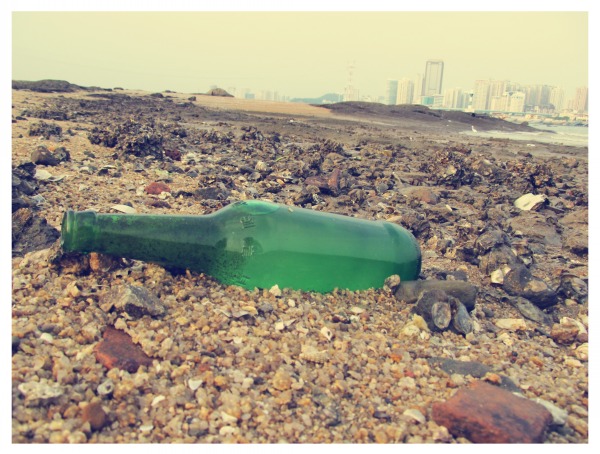 我看到了一个灌满海水的绿色酒瓶。像是一个搁浅的漂流瓶,无力的瘫在沙石上,它是在等人拾起带走,还是期待涨潮,海水将它带向更远的地方呢?