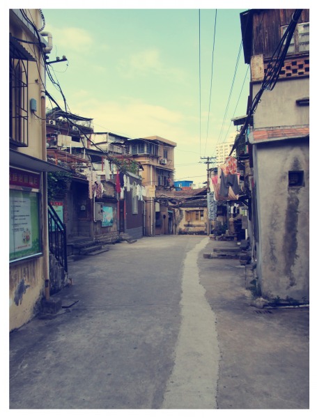 所幸我们知道它最近的公交站。步行许久才找到那个公交站,后面有一条小路,通向一条小巷。转弯,豁然开朗,远处的高楼矗立,似乎很近,旁边一座老旧的庭院便是我们的旅馆。