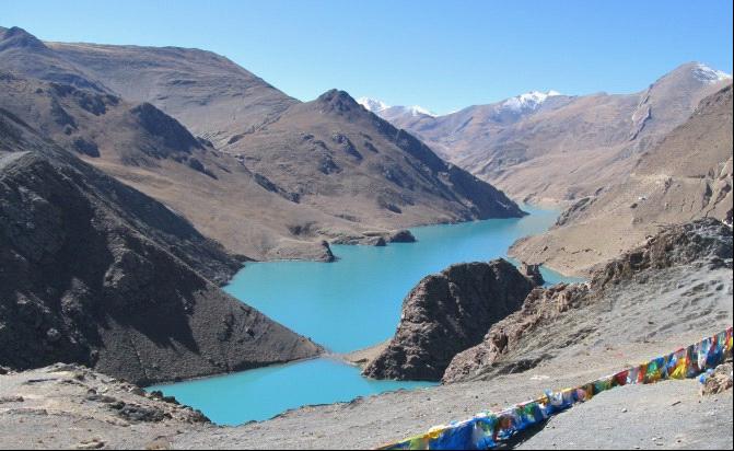 在满拉水库的一个山口,踩在千万年来碎石与泥土堆起的山上,温暖的阳光洒在身上,我忘记了先前在冰川前的刺骨寒意。看着弯曲漫延在寸草不生的山体之间的水库,有风,吹得身后的千百条缠绕的幡旗呼呼作响。我举起相机想拍下那奇异的水色,又接到了电话,我忘了我们说了什么,很遗憾,信号不好,断了。