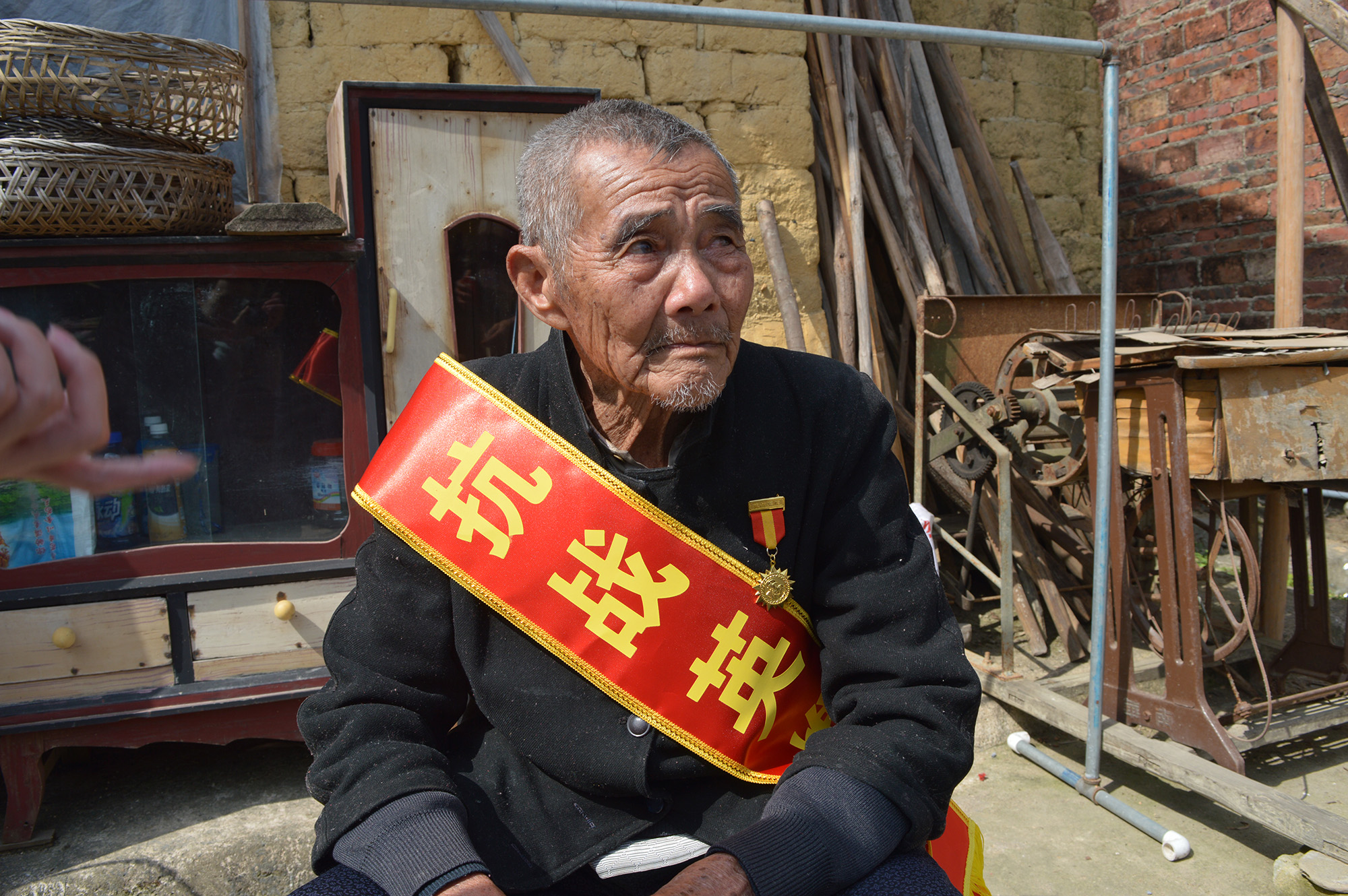 上一次来时,我们便知道老兵记性很差,似乎有老年痴呆,我们的问好没有回应,我们送上的礼金和物品都不敢兴趣。只是坐在门口,有些不耐烦地配合我们拍照。那时候,我们进去他的房子看了一眼,泥土砖房,昏暗破旧,只放得下一张床,老兵的妻子便躺在床上。另外一位志愿者告诉我,他妻子中风了,夫妻俩很多时间都是卧床。